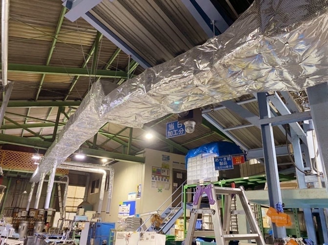 工場などの配管や、ボイラーの配管や装置など、外部の熱の影響を受けないように、断熱材を設置する工事です。