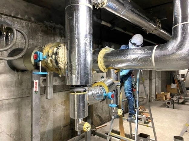 工場などの配管や、ボイラーの配管や装置など、外部の熱の影響を受けないように、断熱材を設置する工事です。